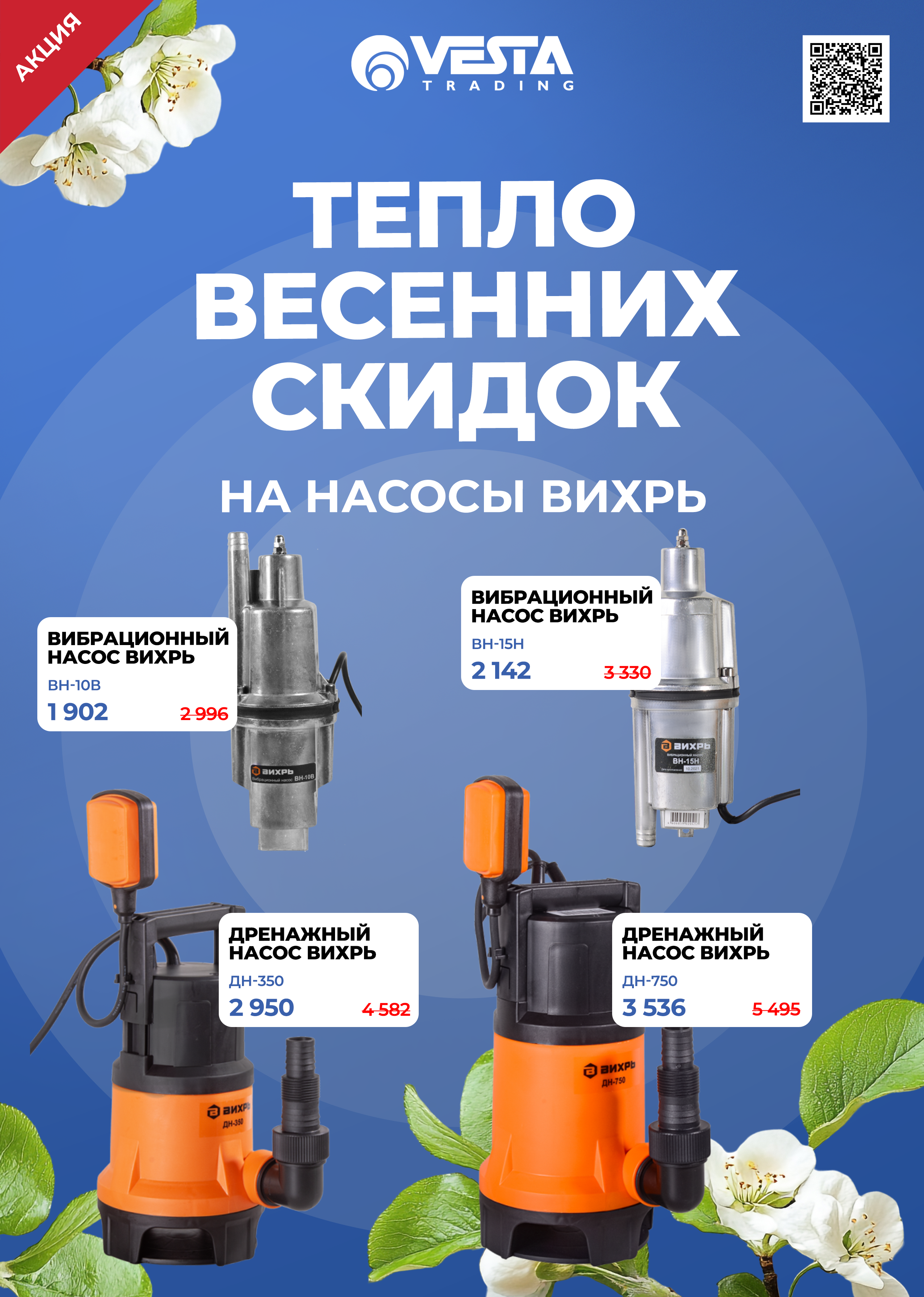 Уважаемые покупатели, только в розничной сети «Веста Трейдинг» вас ждут специальные условия на покупку насосов «Вихрь». Ждем Вас в наших магазинах и на сайте www.vestatrade.ru/. Более подробную информацию по наличию и ценам уточняйте у продавцов-консультантов розничной сети «Веста Трейдинг».