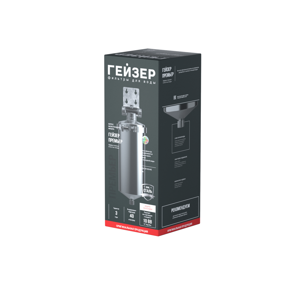 Гейзер-Премьер 10BB 1" устанавливается на вход в систему горячего или холодного водоснабжения. Корпус фильтра изготовлен из высококачественной нержавеющей стали марки 304L, устойчивой к возникновению коррозии, что гарантирует высокую надежность и многолетнюю работу фильтра.