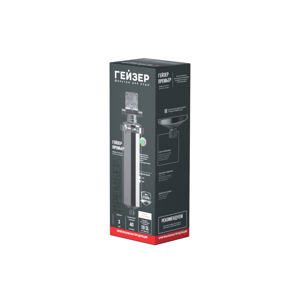Гейзер-Премьер 10SL 3/4" устанавливается на вход в систему горячего или холодного водоснабжения. Корпус фильтра изготовлен из высококачественной нержавеющей стали марки 304L, устойчивой к возникновению коррозии, что гарантирует высокую надежность и многолетнюю работу фильтра.