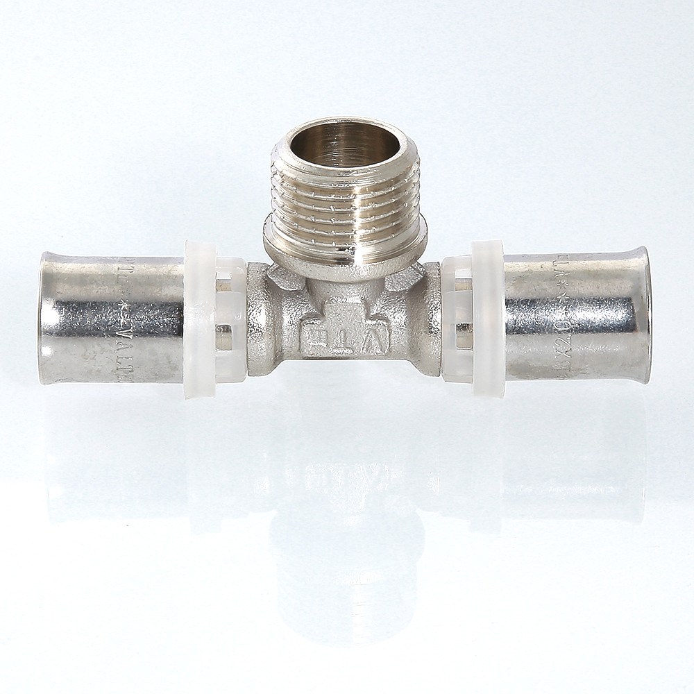 Пресс-фитинг – тройник с переходом на наружную резьбу предназначен для подсоединения к металлопластиковым (металлополимерным) трубам или трубам из сшитого полиэтилена элемента системы с внутренней резьбой.
