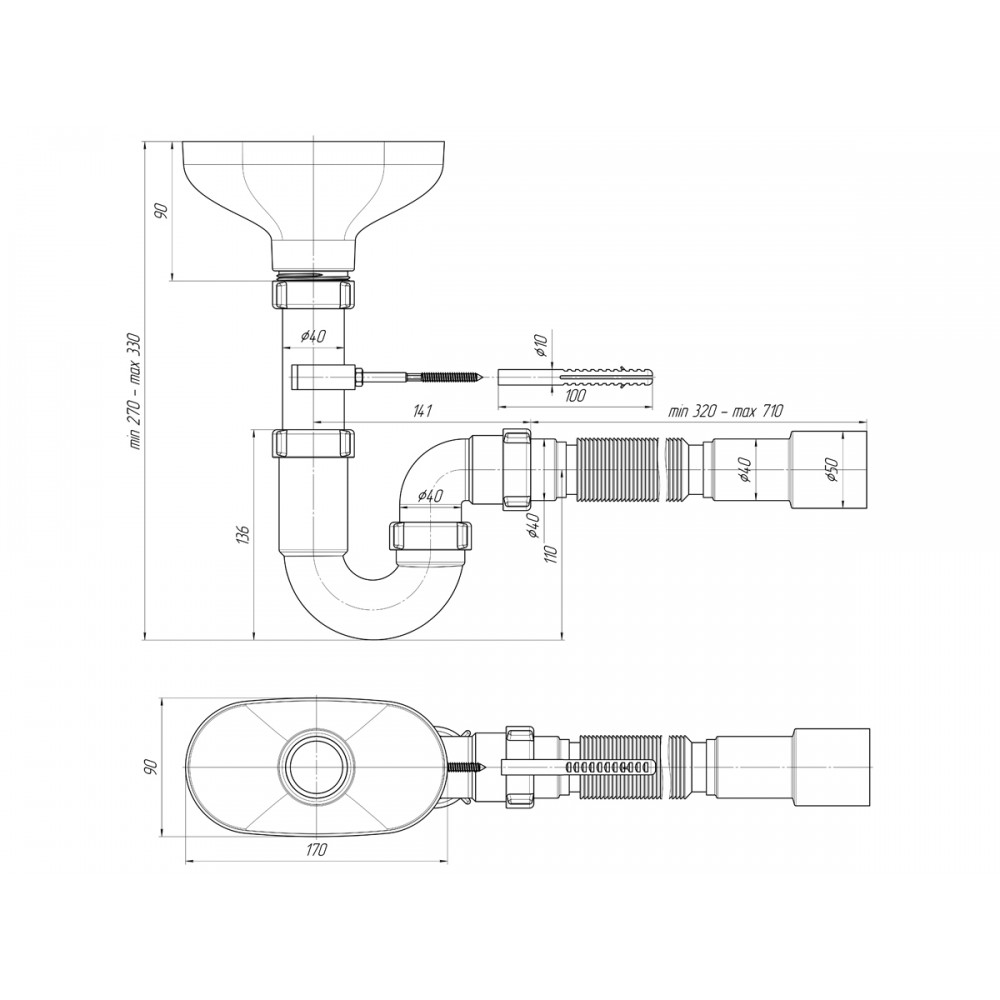 Сифон АНИ 1.1/2"*40 прямоточн. с разрывом струи с гибкой трубой 40*40/50