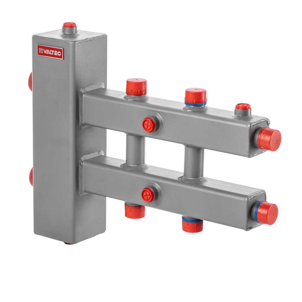 (VTc.100.SN) Гидроразделитель с коллектором предназначен для разделения и гидравлической увязки между собой контуров источника и потребителей тепла. Гидроразделитель и коллекторы выполнены из черной стали, имеют прямоугольное сечение.