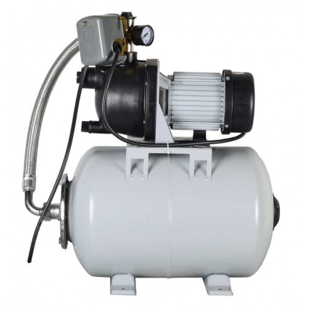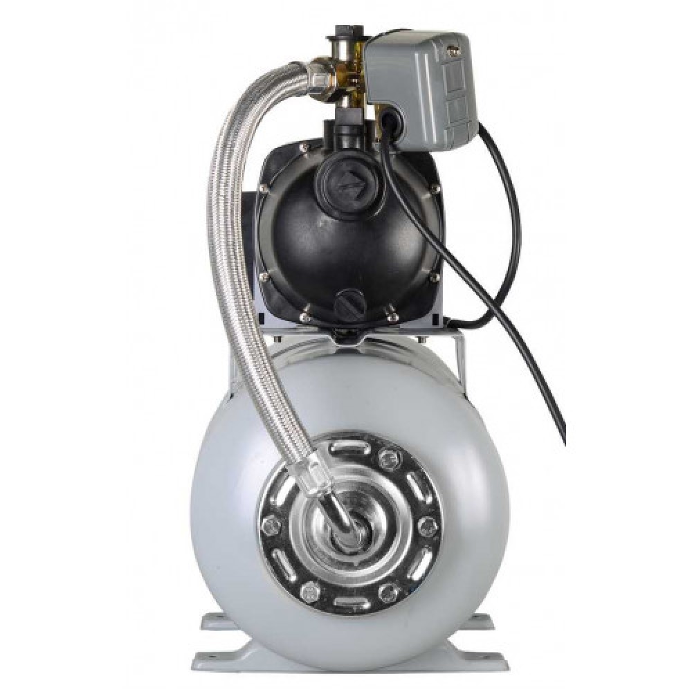 Станция выполнена с гидроаккумулятором 24 л и насосной частью в пластиковом корпусе; автоматика включает и отключает насос по мере расходования воды потребителями.