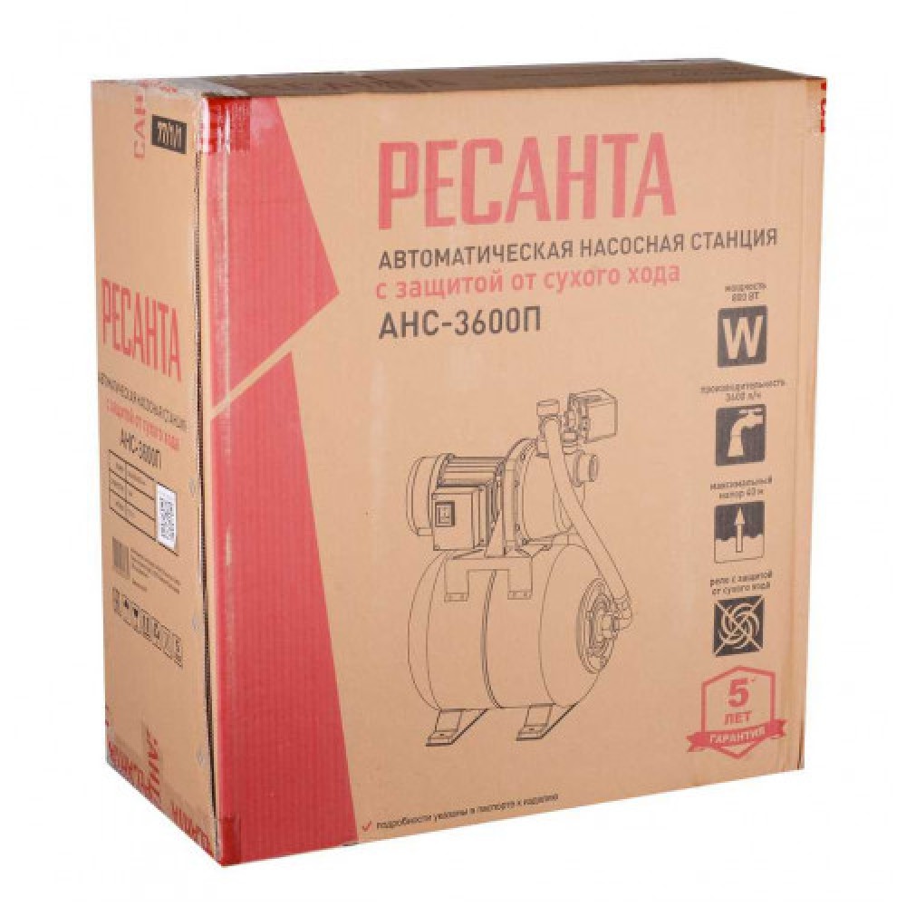 Автономная насосная станция Ресанта АНС-3600П мощностью 800 Вт, максимальным напором 40 м и подачей до 3600 л/ч (≈60 л/мин) предназначена для автоматического водоснабжения дома и дачи с поддержанием давления в трубопроводе.
