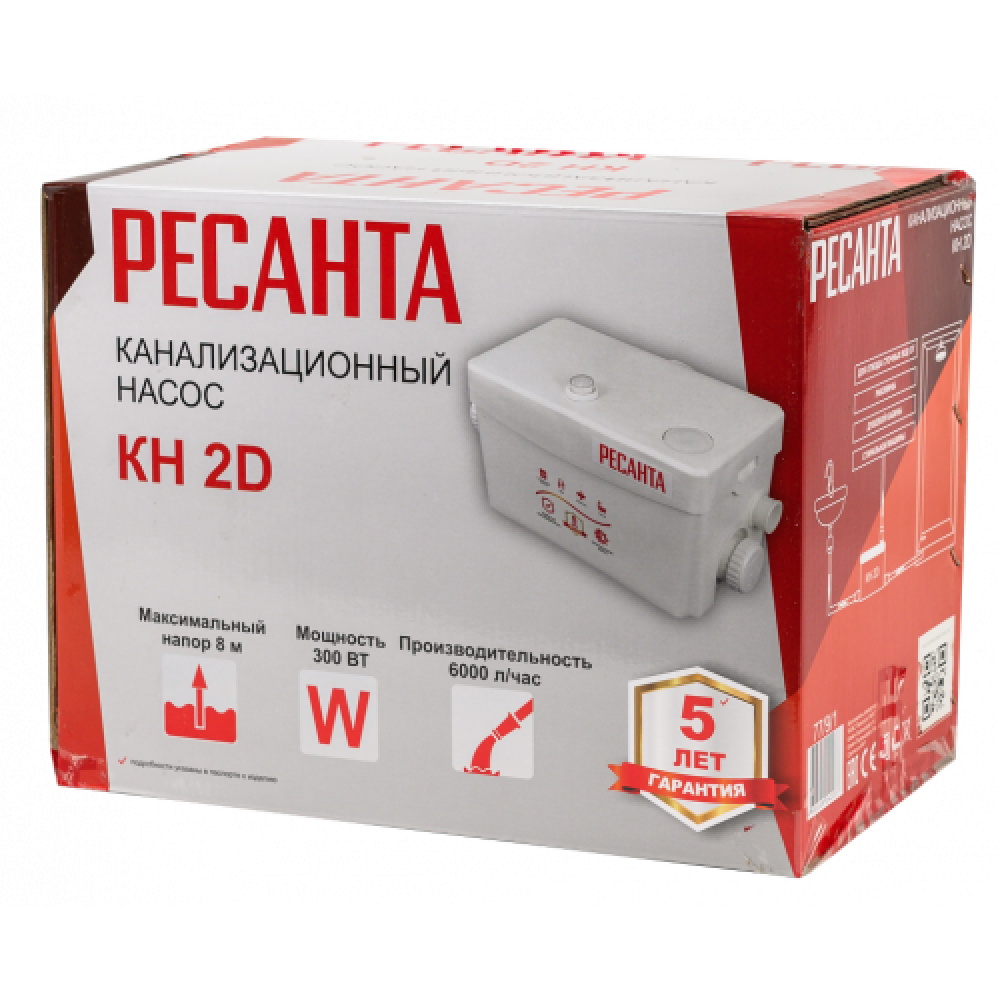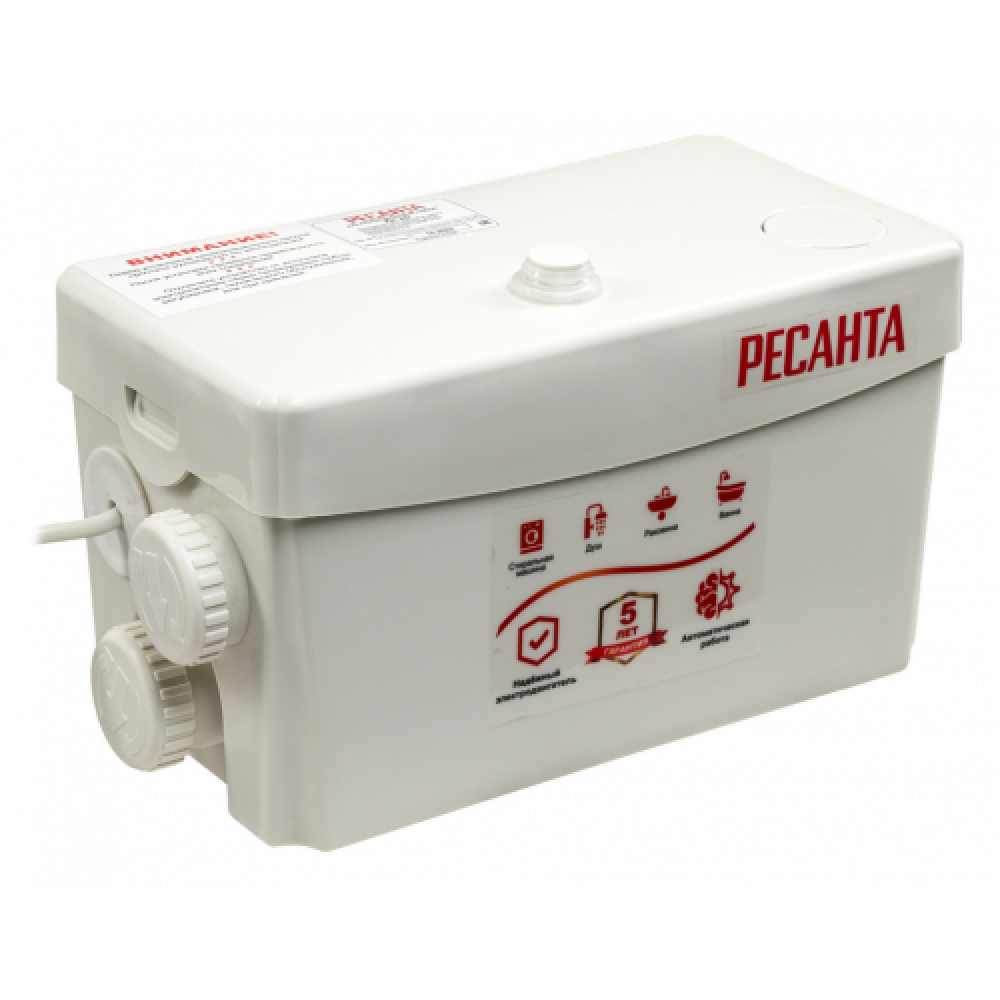 Канализационная установка Ресанта КН 2D мощностью 300 Вт и производительностью до 100 л/мин предназначена для отвода сточных вод от умывальника, душа и других бытовых сливов там, где невозможно сделать самотёк по наклонным трубам.