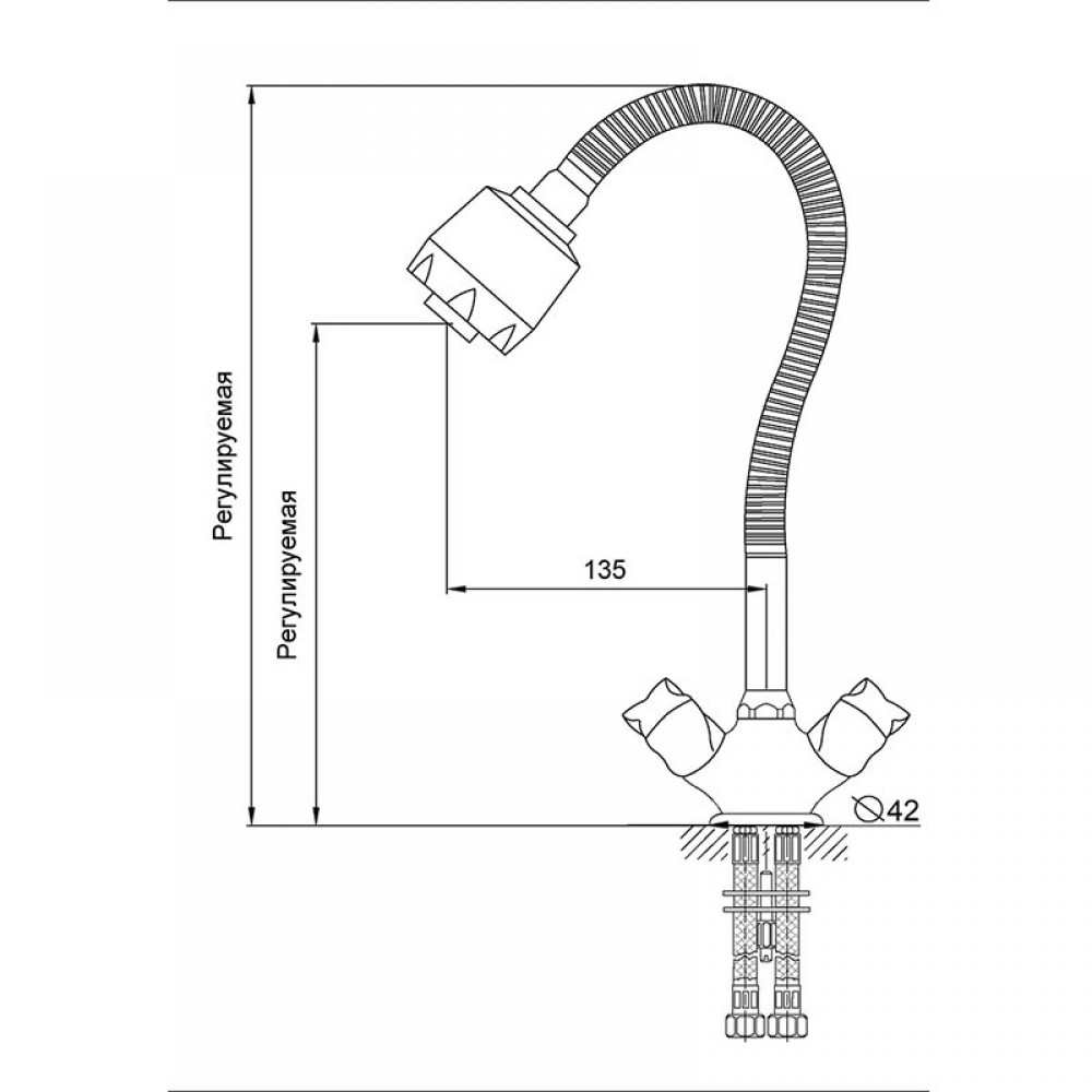 Рефлекторный (гибкий) R-излив позволяет направлять струю воды в любую точку чаши, что особенно полезно при очистке кухонной раковины или мытье крупных овощей. Корпус изготовлен из латуни и покрыт плотным слоем хрома. Управление подачей воды осуществляется за счет надежных кран-букс с резиновыми прокладками.