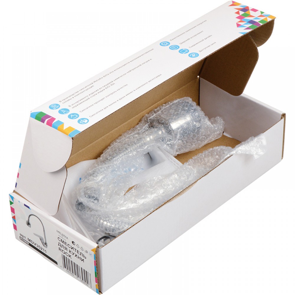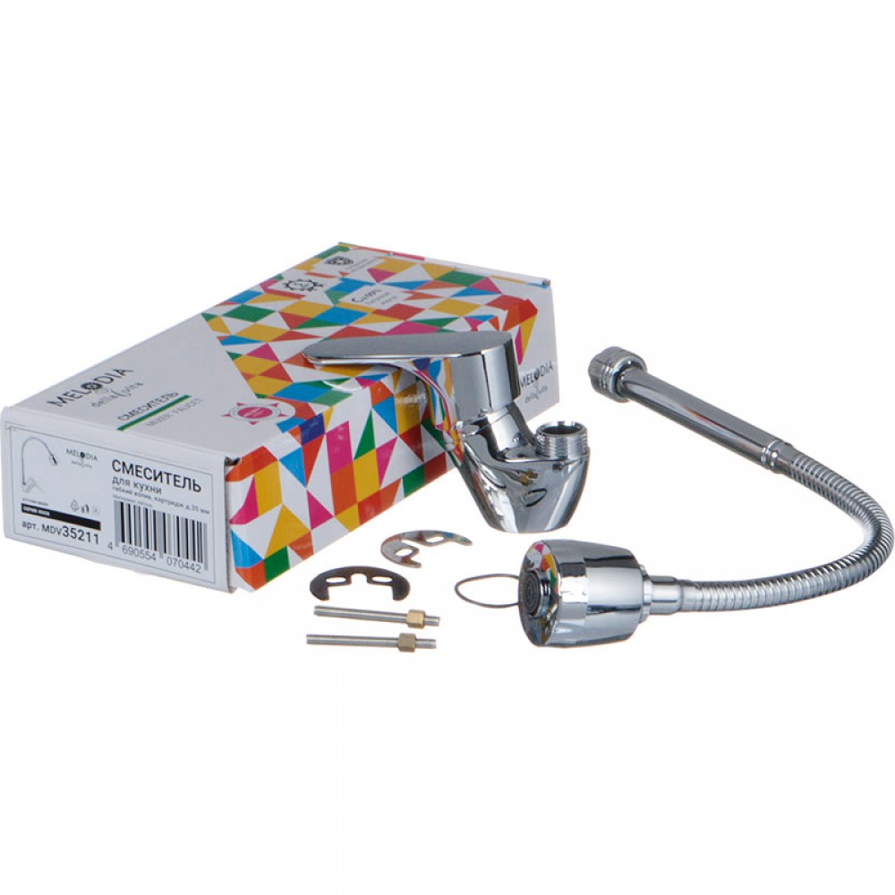 Однорычажный кухонный смеситель MELODIA Rock MDV35211 оборудован гибким изливом для удобного мытья посуды и продуктов. Кран для кухонной мойки с картриджем 35 мм выполнен в современном стиле и рассчитан на комфортное использование благодаря настраиваемой высоте и углу подачи струи.