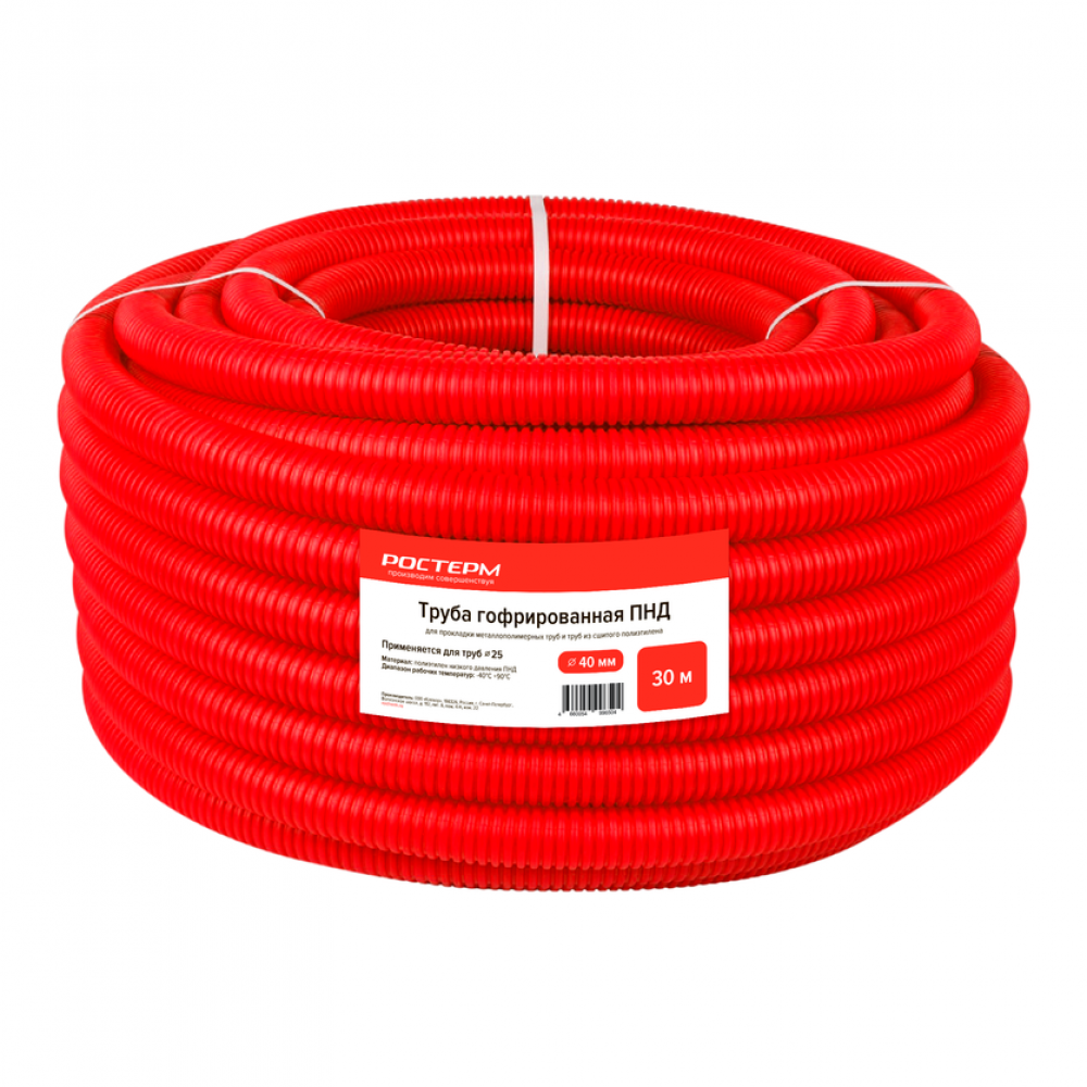 Труба гофрированная ПНД d40 мм 30 м красная изготовлена из полиэтилена низкого давления (ПНД) диаметром 40 мм, для полимерных труб диаметром 25 мм, применяется преимущественно для скрытого монтажа в бетонной стяжке для горизонтальных систем отопления, водоснабжения и систем поверхностного обогрева. Труба гофрированная используется как защитный кожух для системы водоснабжения и отопления от механических повреждений, воздействия внешней среды и обеспечивает компенсацию температурного расширения трубопроводов в стяжке.Преимущества: